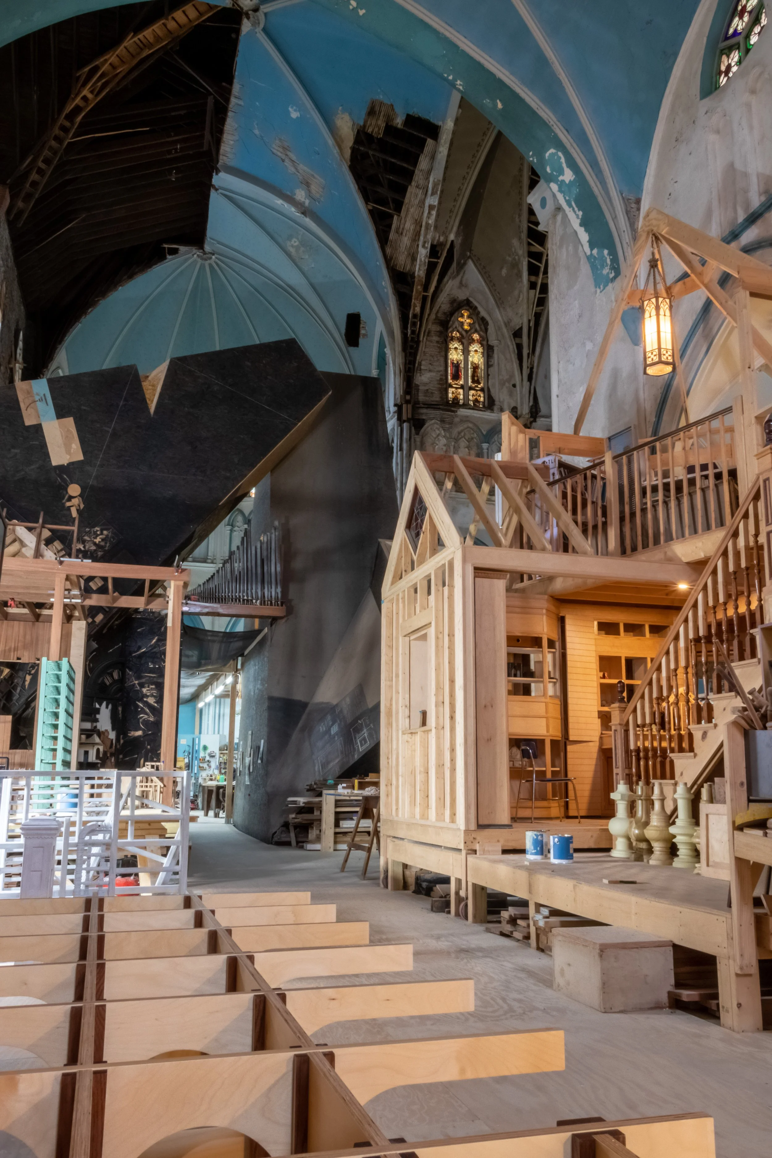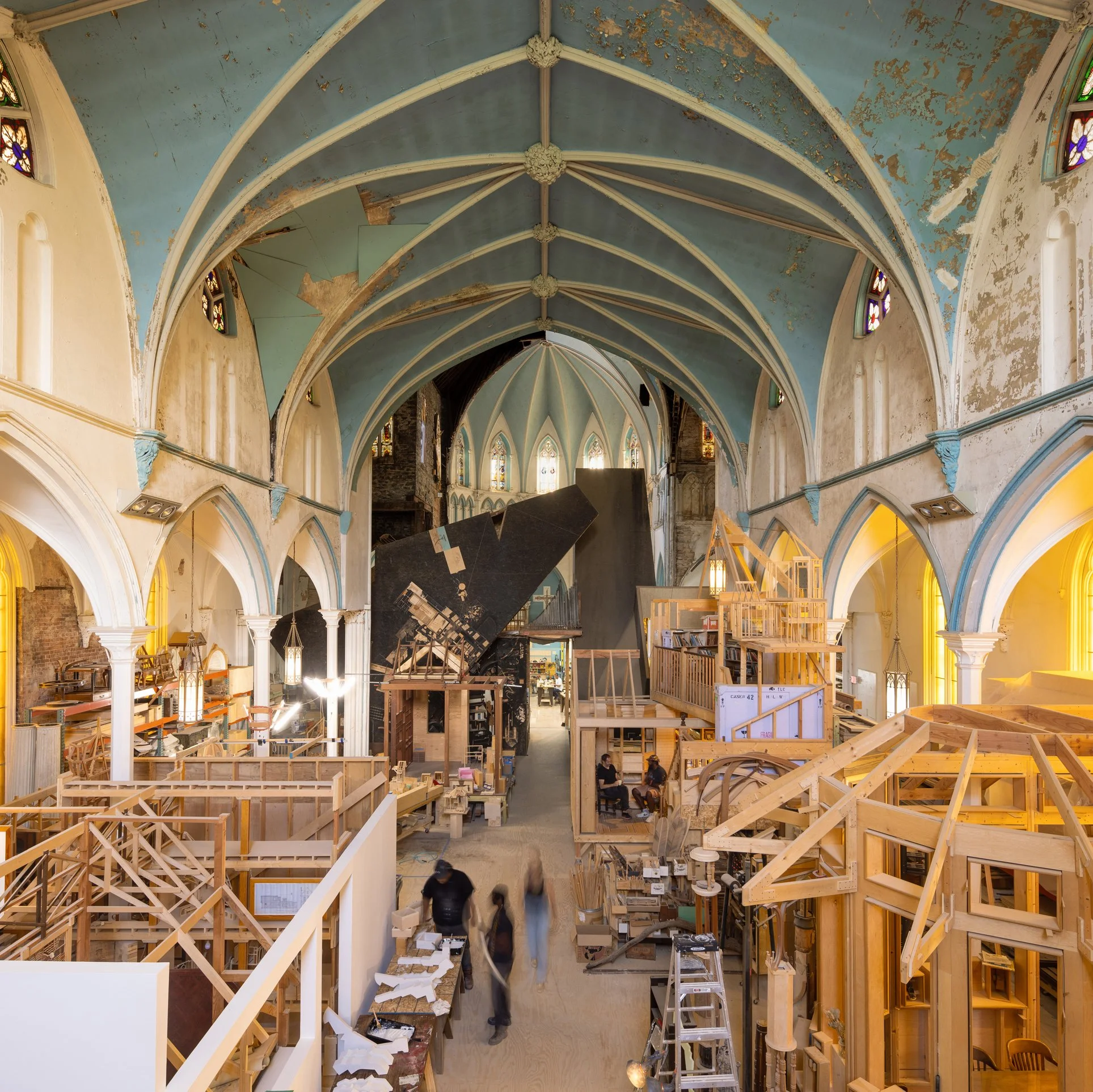 Installations at The Assembly House—including displays of architectural elements, tool and workshop areas, drawing archives, libraries, and gathering spaces—are conceived as miniature buildings within the building, together forming a fantastical model city. The newly designed spaces overlay with historic features of the church and its ceremonial past. The entire ensemble evolves each day with people learning skills of construction and design.